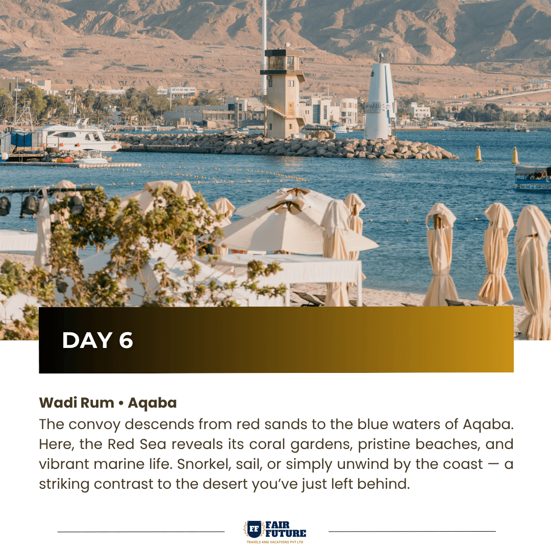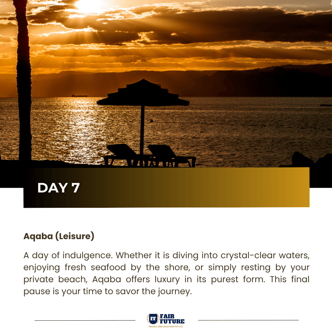 A day of indulgence. Whether it is diving into crystal-clear waters, enjoying fresh seafood by the shore, or simply resting by your private beach, Aqaba offers luxury in its purest form. This final pause is your time to savor the journey.