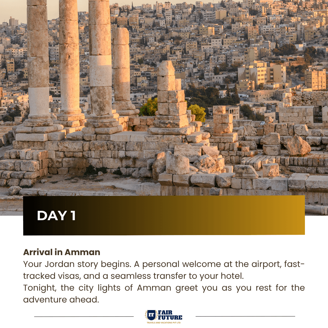 Your Jordan story begins. A personal welcome at the airport, fast-tracked visas, and a seamless transfer to your hotel. Tonight, the city lights of Amman greet you as you rest for the adventure ahead.