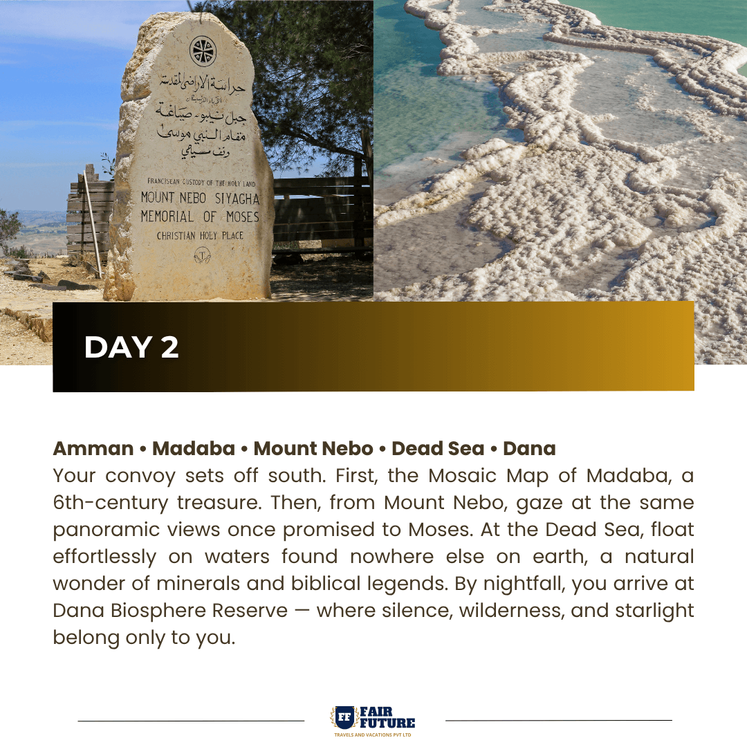 Your convoy sets off south. First, the Mosaic Map of Madaba, a 6th-century treasure. Then, from Mount Nebo, gaze at the same panoramic views once promised to Moses. At the Dead Sea, float effortlessly on waters found nowhere else on earth, a natural wonder of minerals and biblical legends. By nightfall, you arrive at Dana Biosphere Reserve — where silence, wilderness, and starlight belong only to you.