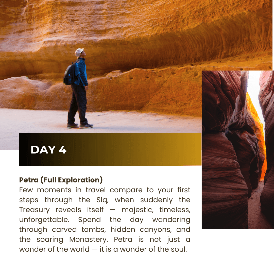 Few moments in travel compare to your first steps through the Siq, when suddenly the Treasury reveals itself — majestic, timeless, unforgettable. Spend the day wandering through carved tombs, hidden canyons, and the soaring Monastery. Petra is not just a wonder of the world — it is a wonder of the soul.