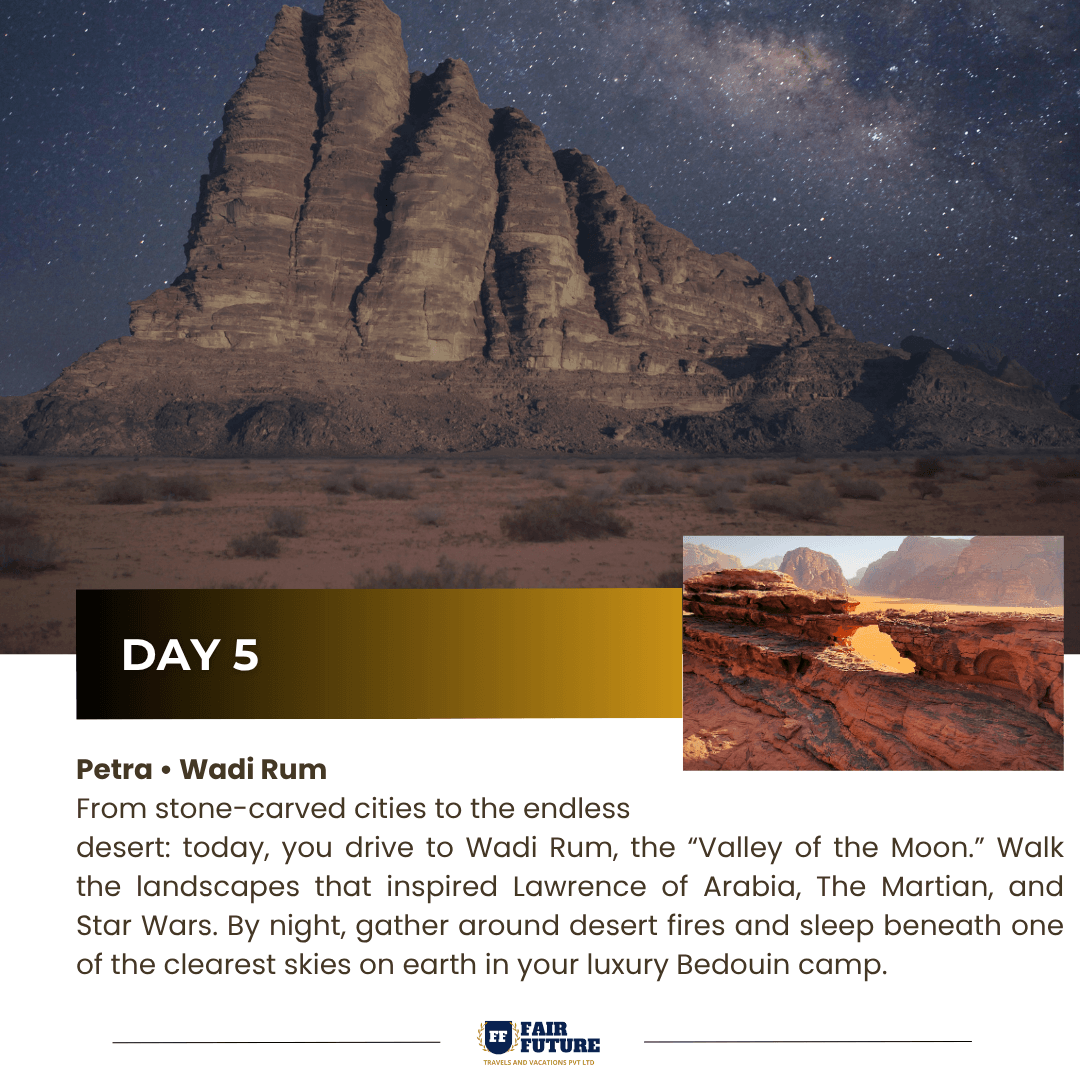 From stone-carved cities to the endless desert: today, you drive to Wadi Rum, the “Valley of the Moon.” Walk the landscapes that inspired Lawrence of Arabia, The Martian, and Star Wars. By night, gather around desert fires and sleep beneath one of the clearest skies on earth in your luxury Bedouin camp.